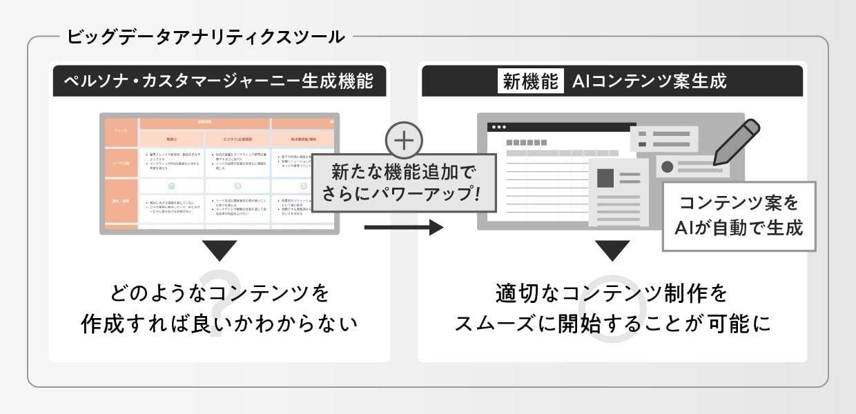 マーケティングのツールとコンサルティングサービスを提供する株式会社CINC(東京都港区 代表取締役社長 石松友典、以下CINC)は、社内で開発・利用しているビッグデータアナリティクスツールに、カスタマージャーニーをもとにしたコンテンツ案を生成する「AIコンテンツ案生成機能」を追加しました。製品情報とユーザーインタビューデータを入力することで、AIがペルソナとカスタマージャーニーを作成する「ペルソナ・カスタマージャーニー生成機能」の追加機能として、さらに自動化の対象範囲が広がりました。