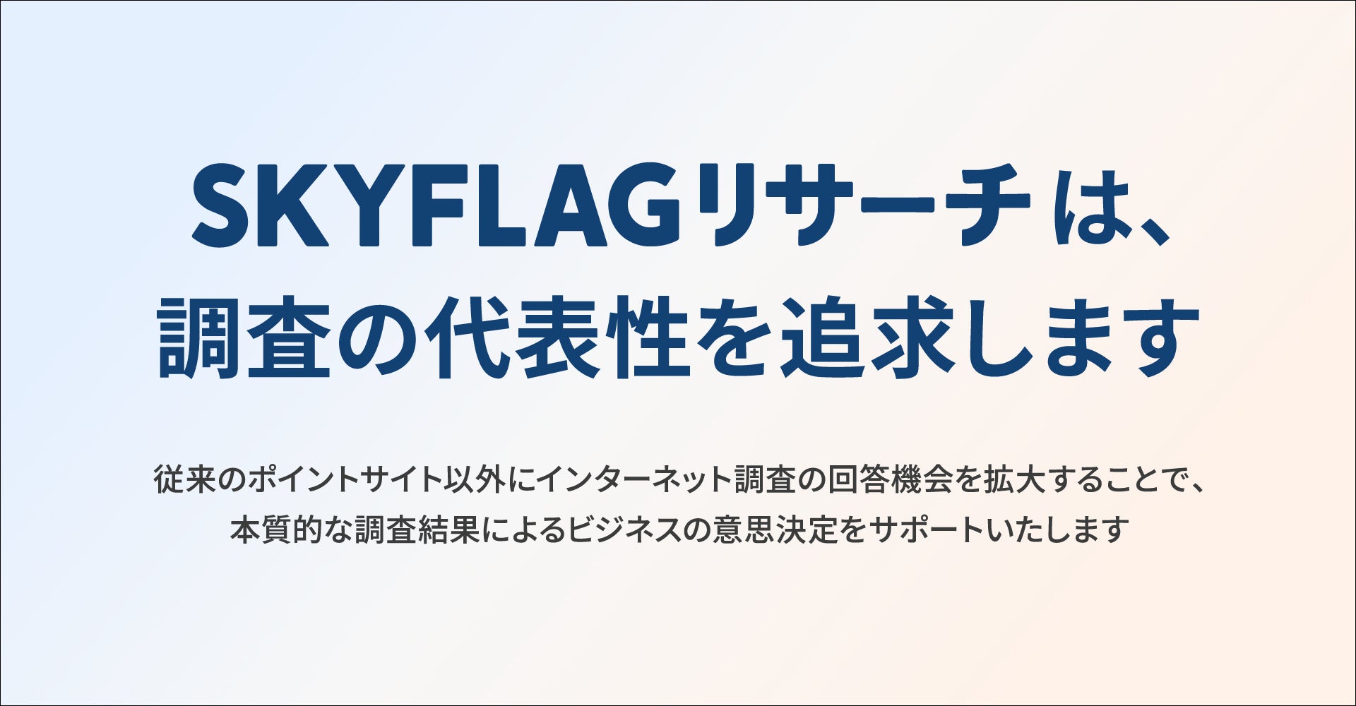 『SKYFLAGリサーチ』は、代表性を追求するマーケティングリサーチサービスです。従来活用されてきたポイントサイトに限らず、『SKYFLAG』を通した多様なメディアを活用してインターネットリサーチ調査の回答機会を拡大することで、本質的な調査結果によるビジネスの意思決定をサポートいたします。