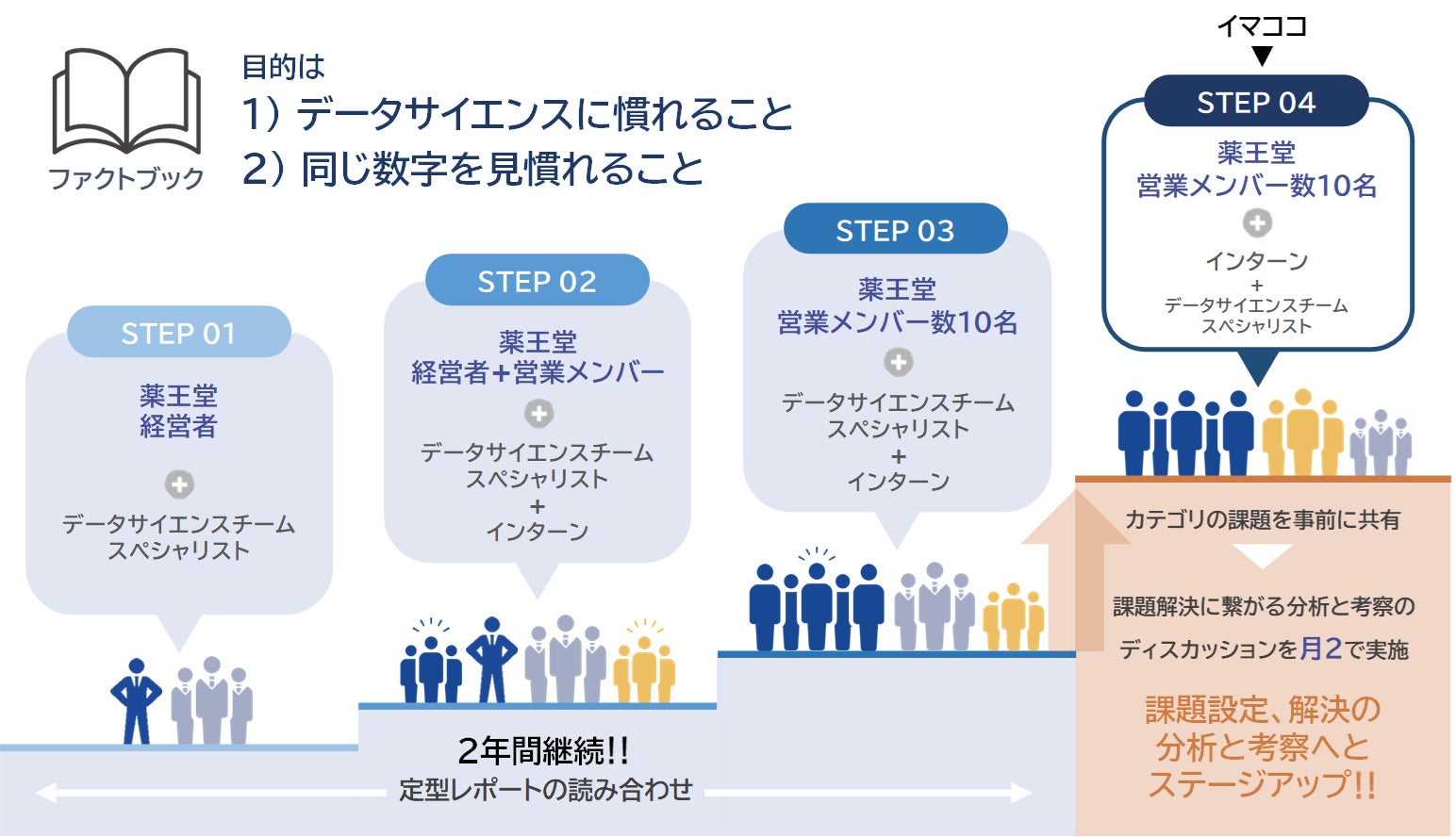 関わるメンバーも、極少人数から随時増加していき、現在は薬王堂営業メンバー数10名が、データサイエンスチームとインターン生と共にデータ活用を進めています。この取り組みをファクトブックと呼んでいます。