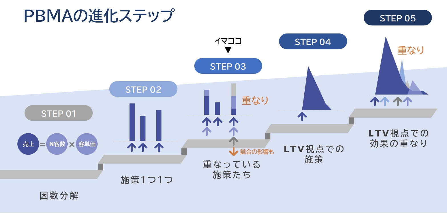 薬王堂PBMAでは、まず施策1つ1つの効果を明らかにし、さらに施策同士の重なり(相乗効果や打消し効果)を検証していきます。将来的には、施策の中長期の残存効果(LTV視点)とその重なりも検証していきます。