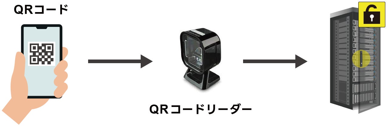 従来のカード認証に加えQRコード認証によるラック解錠に対応しました。これにより、カードを物理管理する手間が不要になり、データセンターの省人化を支援します。QRコードの表示は、メールなどで受信したスマートフォン画面や発券した用紙など、さまざまな形式に対応可能です。