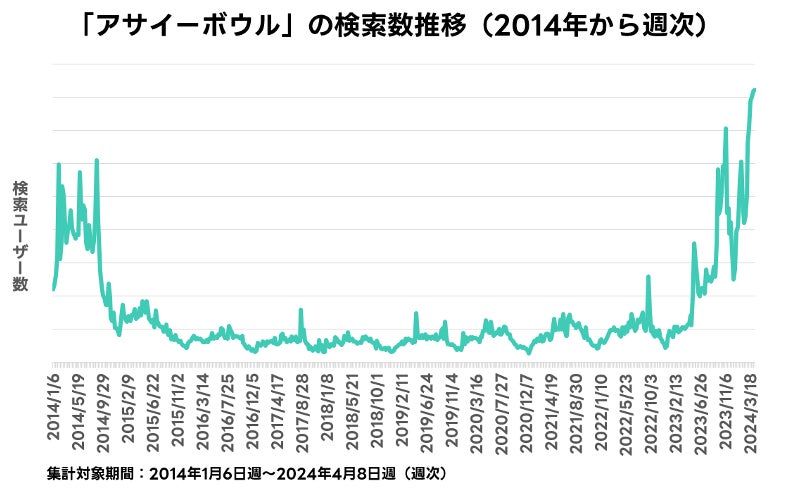 「アサイーボウル」は2014年にブームを迎えた後、検索数は長らく低い水準で推移していました。2023年に入り、テレビ番組「孤高のグルメ」で「アサイーボウル」が取り上げられた5月頃から検索数が再び上昇し、2024年3月には2014年のピークを上回る水準となっています。