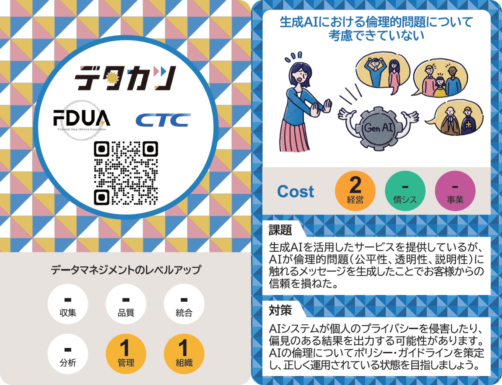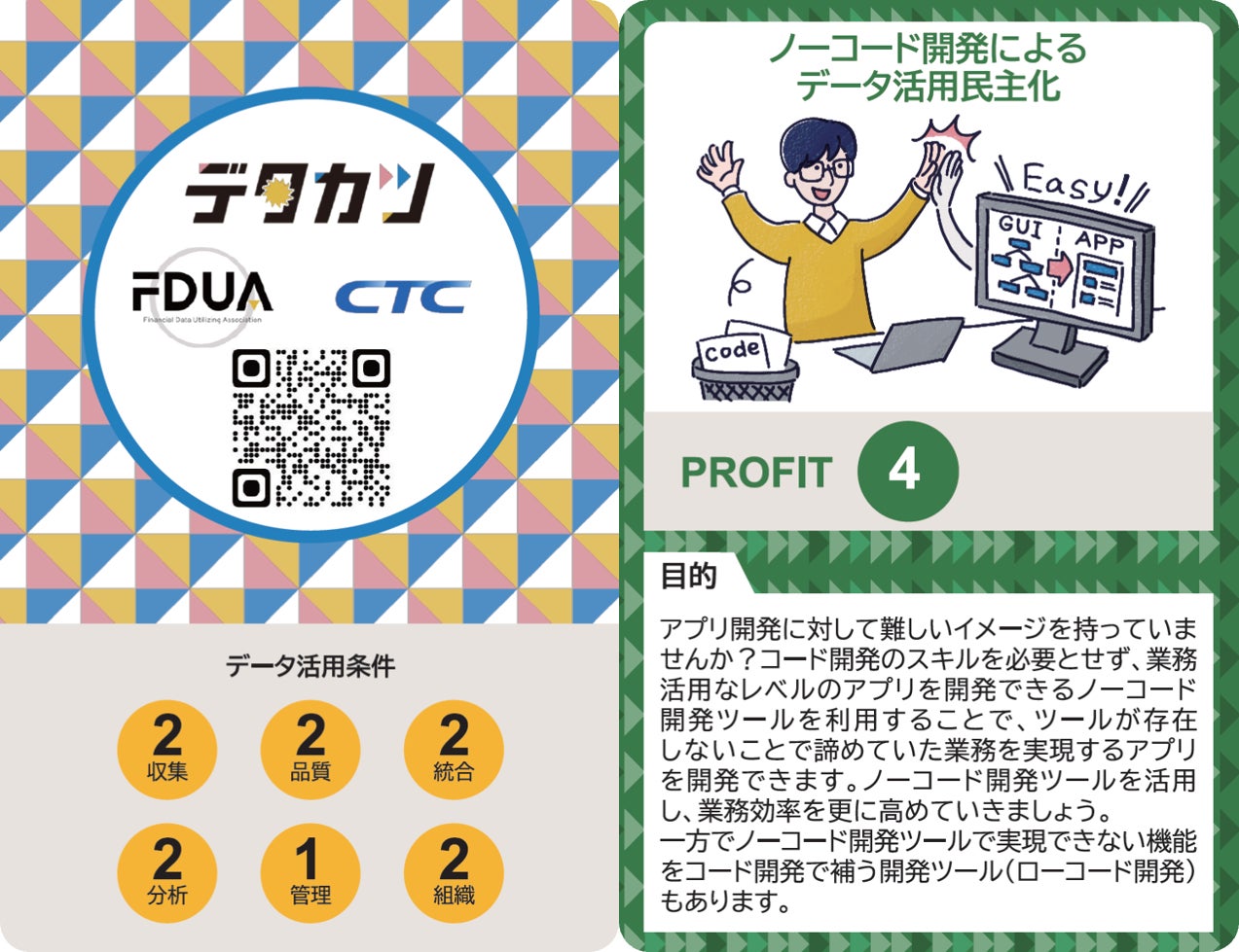 CTCは、データマネジメントシステムの提案活動の中で、より効果的なシステムの導入や定着化を目的として、デタカツの企画やカードの制作を行いました。実際の課題に即した題材にするため、一般社団法人金融データ活用推進協会(FDUA)の協力を受けてカードの記載内容を検討しました。
