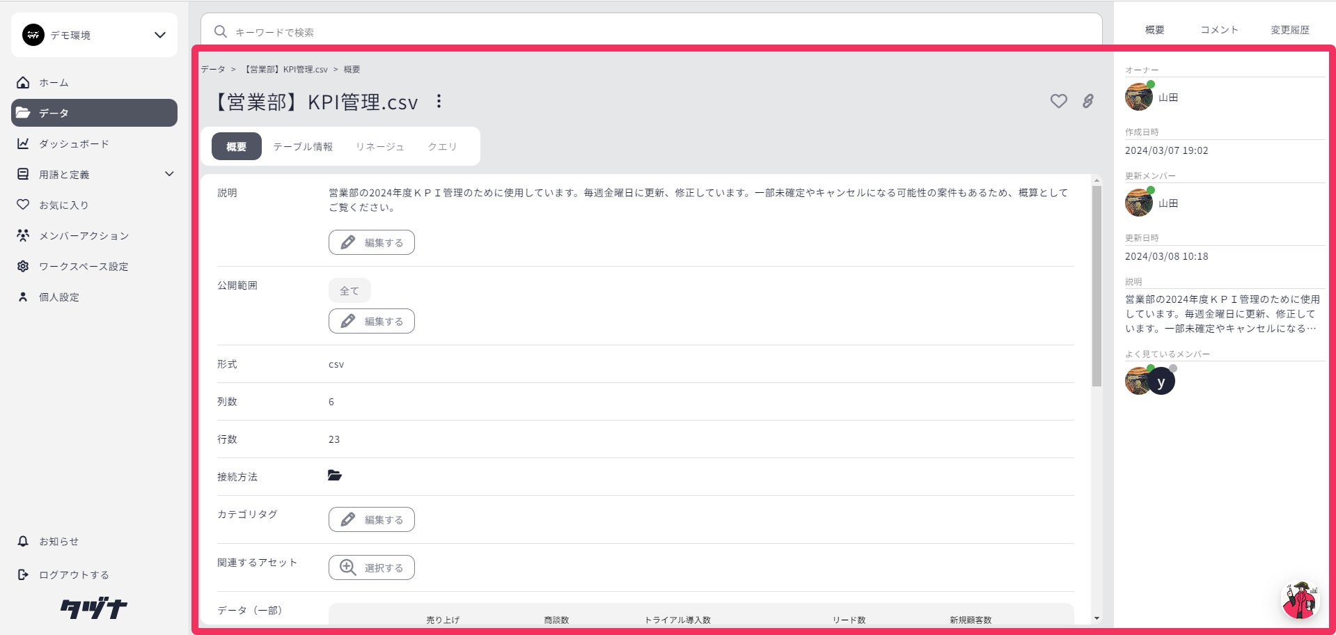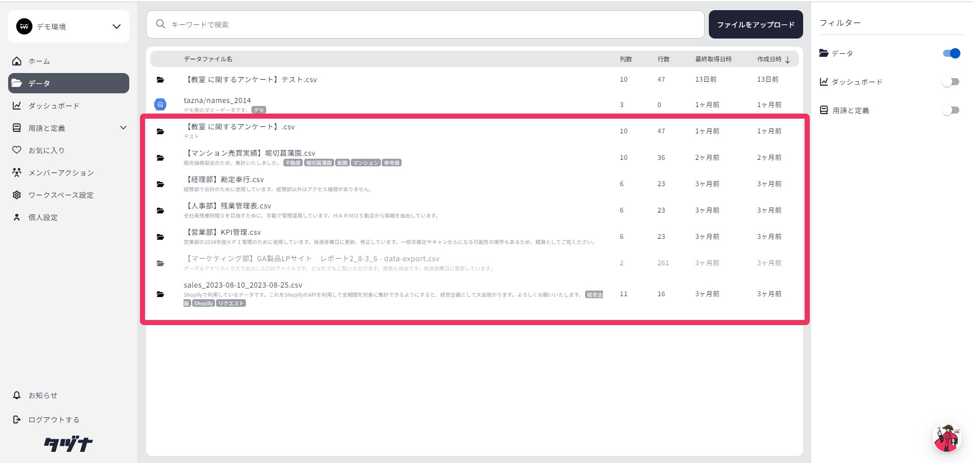 この度のアップロード機能の実装により、タヅナ上でCSVファイルも管理できるようになりました。