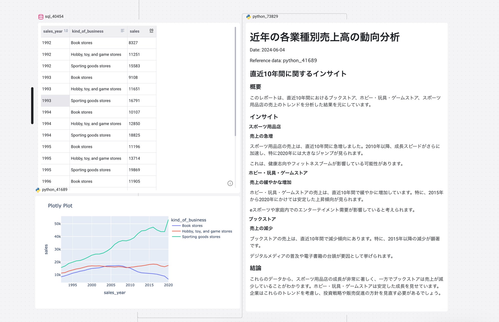 具体的には、ユーザーの指示に基づいて、その指示をタスク分解し、ユーザーに提案します。ユーザーはその提案に対して、実行・修正依頼・キャンセルを選択することができます。タスクの実行に必要なSQLやPythonのコードを自動生成し、自動で実行します。