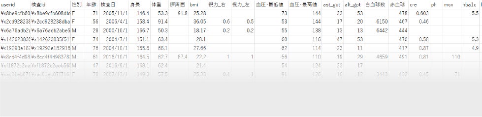 deIDは、集積されたRWDからデータを抽出し、学習などの用途にご利用いただくサービスです。現在用意されたデータセットは健診・検査データのうち「65項目」で構成しております。様々な用途にご利用いただくため、1万人セット、3万人セット、5万人セット、10万人セットの4パターンをご用意しました。ご利用用途に合わせて最適なデータボリュームをご利用ください。