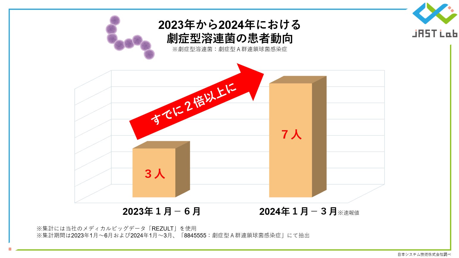 2023年1月から6月までの6ヶ月間と、2024年1月から3月までの3ヶ月間において、劇症型溶連菌の患者数を調査しました。その結果、2024年の3ヶ月間の患者数は、すでに2023年の6ヶ月分の患者数の2倍以上に達していることが分かりました。国立感染症研究所が7月1日に更新した「国内における劇症型溶血性レンサ球菌感染症の増加について(2024年6月時点)」におけるA群溶血性レンサ球菌感染症の発生動向とも似通っており、2024年の感染者数増加が過去に類を見ないものであることが示されています。
