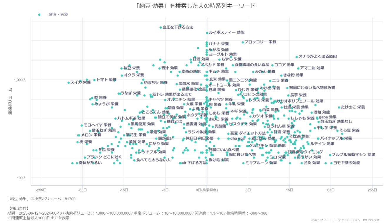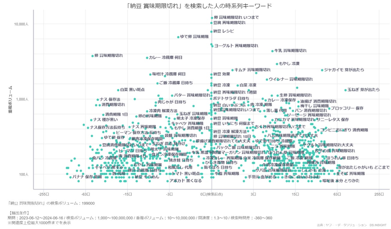 「ヤフー・データソリューション」が提供する、検索や人流データを分析できるデスクリサーチツール「DS.INSIGHT」を活用し、「納豆」と一緒に検索されているキーワードを可視化したところ、「賞味期限切れ」「レシピ」「効果」というキーワードが多く検索されていることがわかりました。