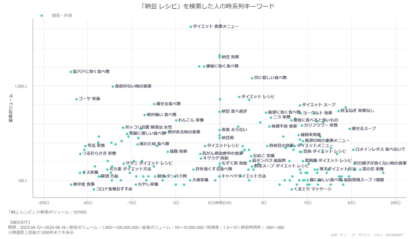 まず「納豆 レシピ」で検索した人の前後の検索動向を健康・医療のカテゴリーに絞ってみたところ、低カロリーや栄養価の高い食べ物に共通するようなキーワードが多い傾向がわかりました。また「ダイエット」「食欲」「体調不良」といったキーワードから、検索している背景が想像できます。