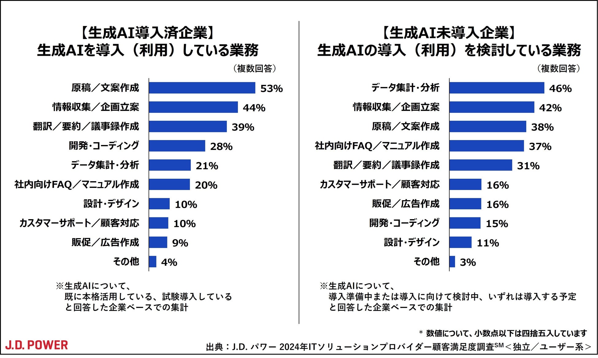 一方、未導入企業においては、生成AIの利用を検討したい業務として、「データ集計・分析」(46%)が最も多く挙がり、続いて「情報収集/企画立案」(42%)、「原稿/文案作成」(38%)となった。また「社内向けFAQ/マニュアル作成」(37%)も多く挙がっている。「データ集計・分析」や「社内向けFAQ/マニュアル作成」ついては、既に生成AIを導入している企業での活用率はそれほど高くはなく、未導入企業における生成AIに対する期待が大きい活用分野とも言える。