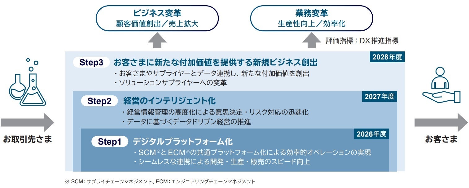 「DX基本方針」に基づき、社員一丸となって「ビジネス変革」と「業務変革」を推進しています。専任の組織であるDX推進部が全社的な方向性やデジタルガバナンス、社内連携を図りながら3つのSTEPで推進しています。