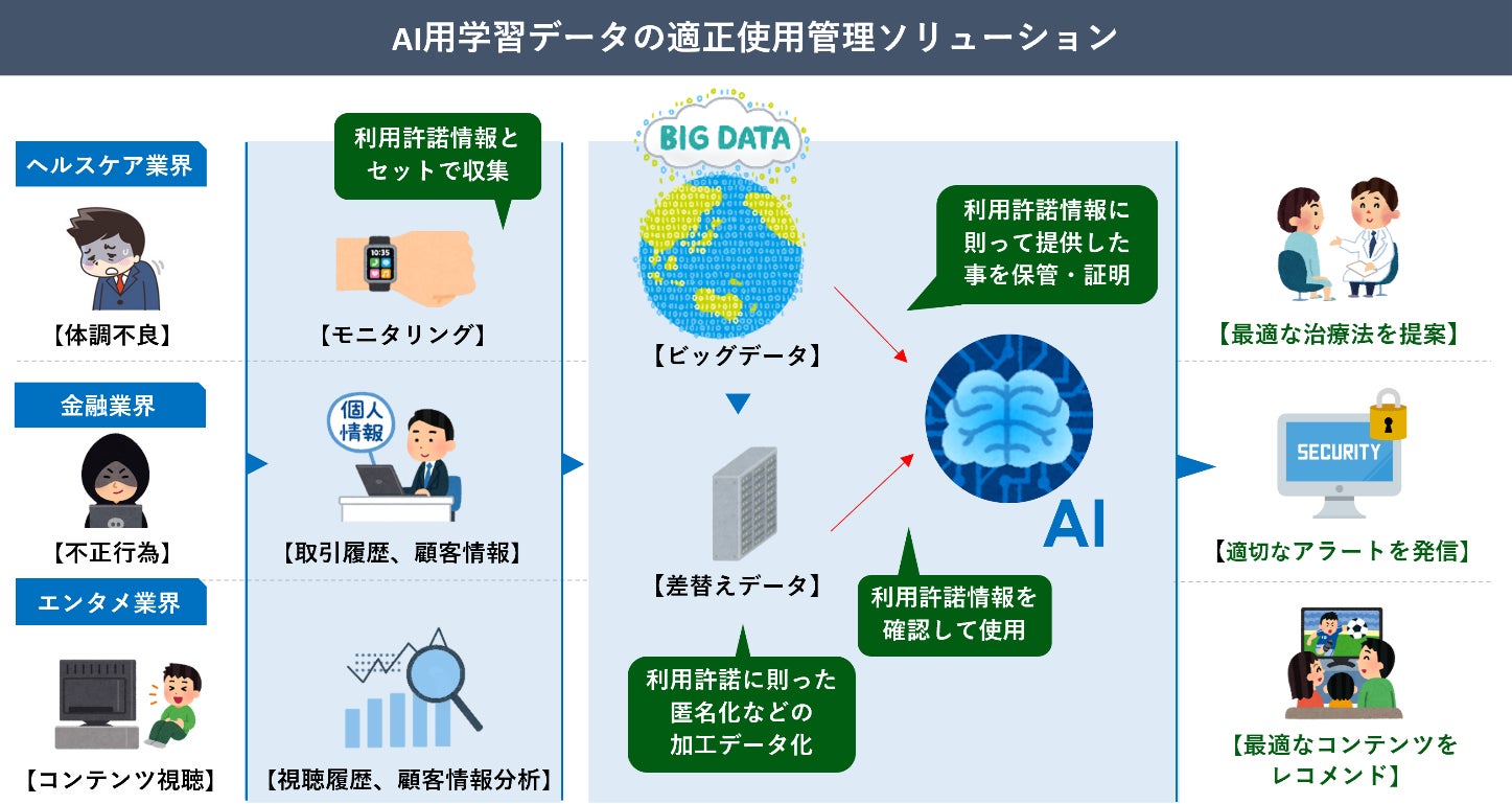 インターネットで取得可能な著作物や、各種デバイスなどから収集されるビッグデータを機械学習に利用する際、その中から利用に配慮が必要な情報を差替えや部分的に加工し、さらに機械学習時の利用状況を記録することで、情報利用が適正であることを証明するとともに、高精度かつ個人のプライバシーや権利などに配慮したAIシステムを実現することができます。