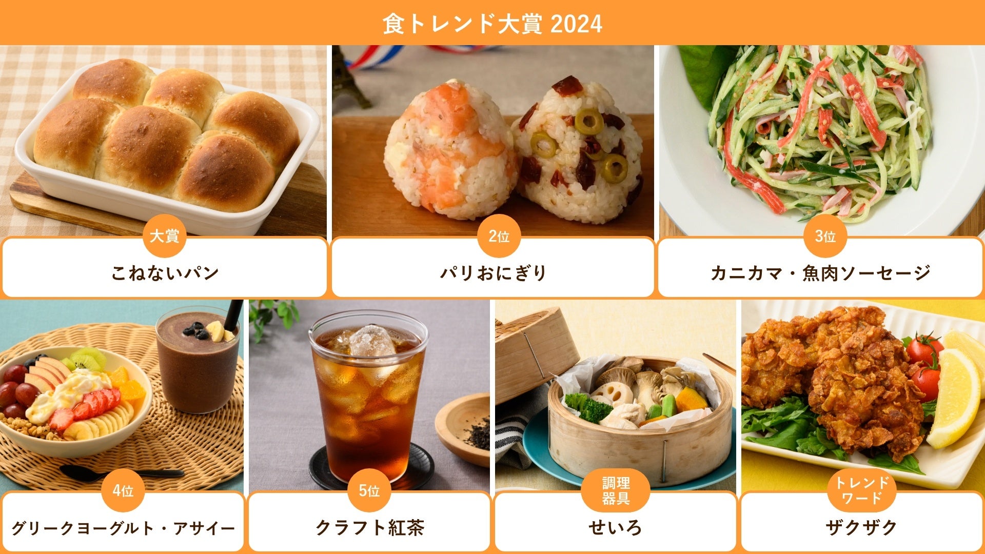 ・食トレンド大賞2024は、コメ不足から人気となった進化系手作りパン「こねないパン」、2位「パリおにぎり」、3位「カニカマ・魚肉ソーセージ」、4位「グリークヨーグルト・アサイー」、5位「クラフト紅茶」、調理器具「せいろ」、トレンドワード「ザクザク」の7件を選出