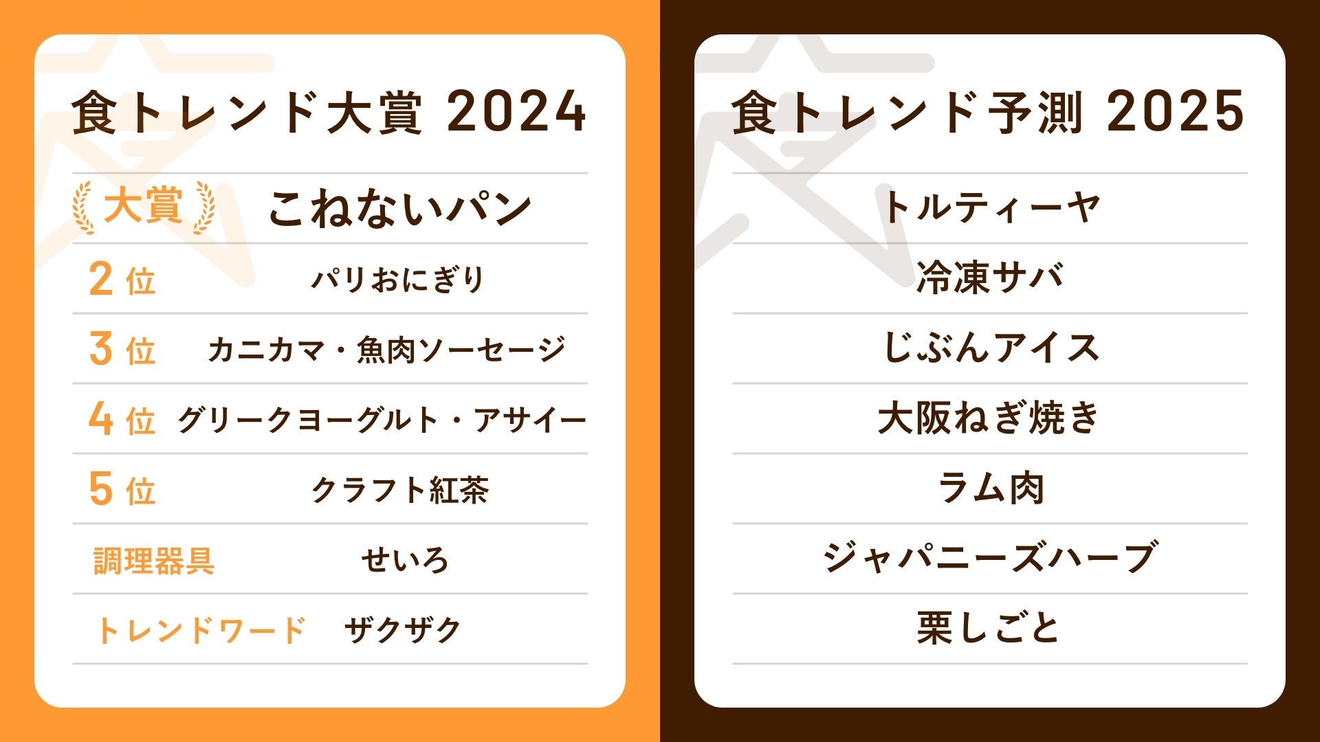 クックパッド株式会社は、日本最大のレシピサービス「クックパッド」の検索キーワードやアクセス動向、月間PV約4,000万・公式SNSのフォロワー数約900万人のニュースメディア「クックパッドニュース」などのデータを元に、2024年を象徴する料理・食材のトレンドおよび2025年の流行の兆しがある料理・食材を選出する、「食トレンド大賞2024・食トレンド予測2025」を発表しました。